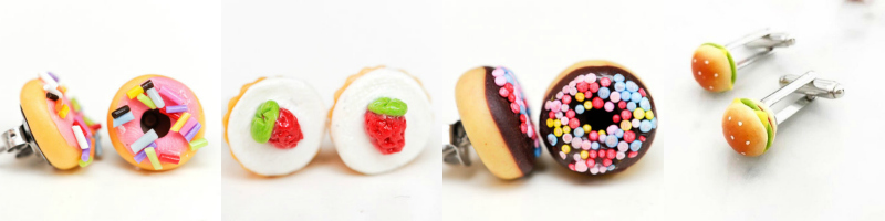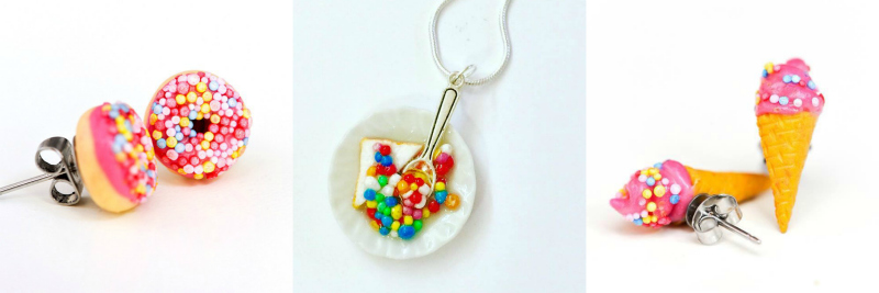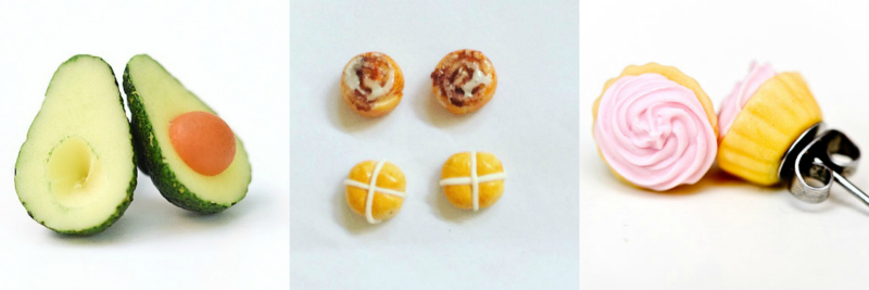 There is a great range of new tea party and foodie inspired jewellery – from polymer clay donuts, cupcakes, avocados and watermelon studs, to miniature china teacups, cake plates, teapots and other delicious treats set onto necklaces.