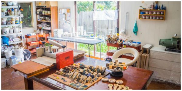 I have basically converted two-thirds of my house into studio space. We have a light-filled back room with big table and shelves in the back half of the house, next to the garden and back door, where I do most of my clay work, and a room dedicated to glaze making.