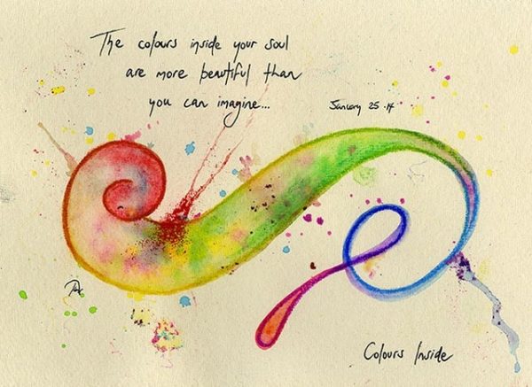 Soul Stories are very simple and concise expressions ~ and about eight years ago now I thought if l was ever going to illustrate them I had to really marry that concept. Sometimes my words can be a little bit broken and hard so l wanted these particular kinds of stories to be balanced with something softer ~ and after lots of research, smooth rounded swirls and lines mixed with bright colours felt completely right and natural for Soul Stories. It wasn’t long after playing around with my first packet of Soft Pastels that my Soul Stories figures came to life, which l guess, kind of represent the soul.