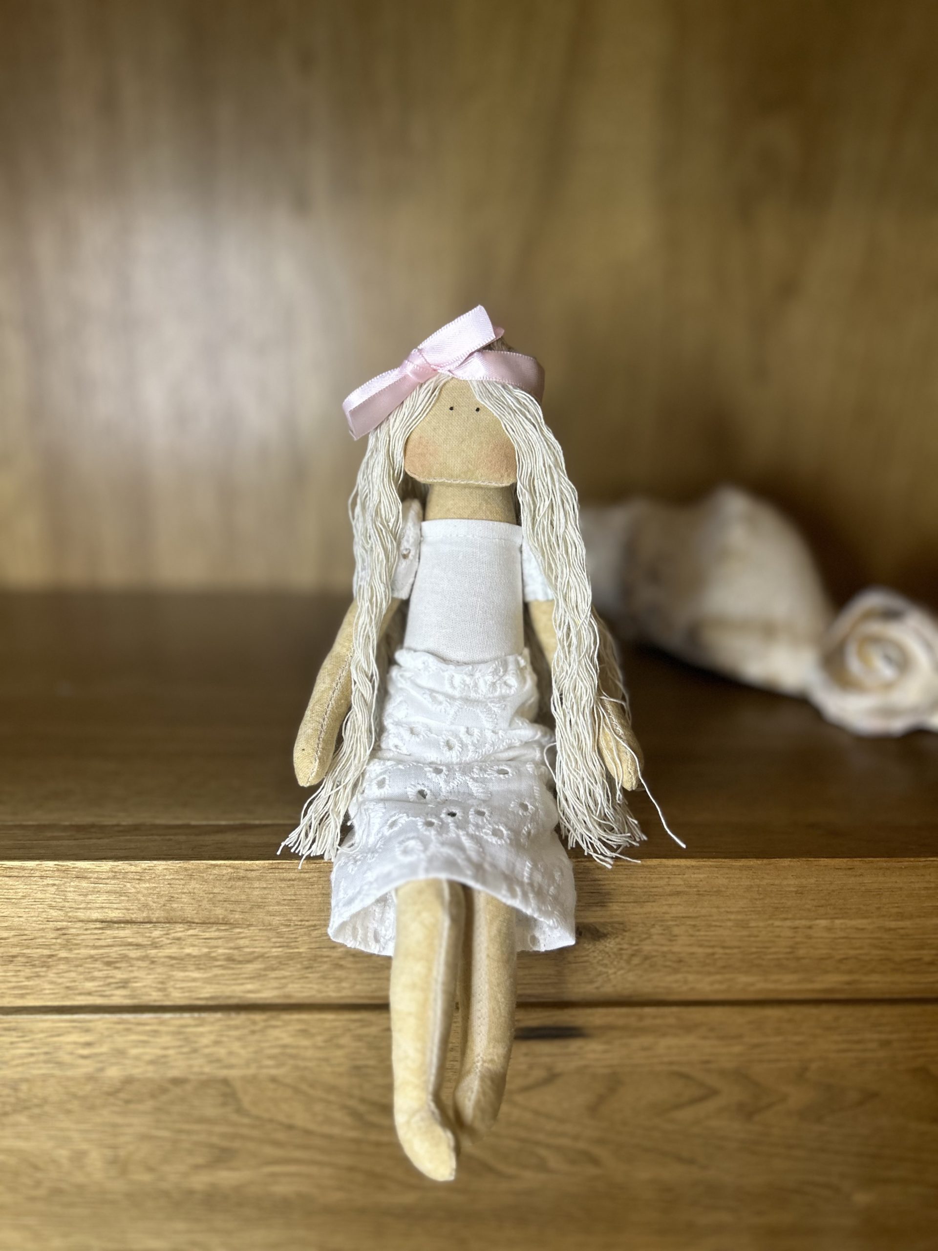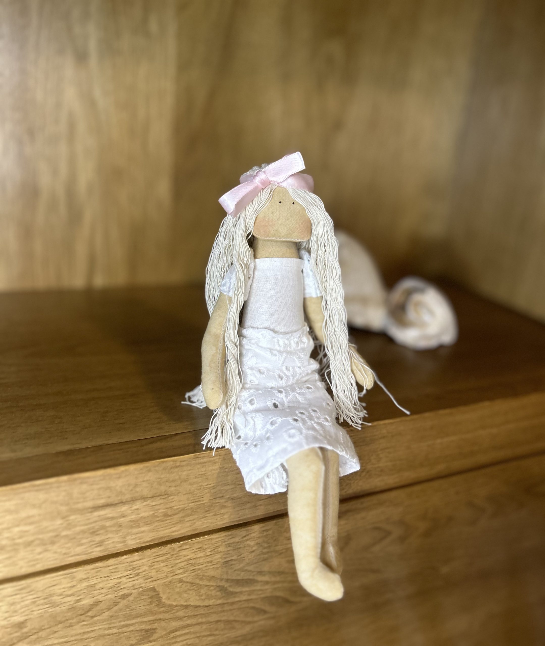 She is handcrafted using a range of complimentary, quality fabrics, including 100% cotton and polyester. Her body is naturally dyed using coffee to give her a warm glow, and her stylish hair is made using new high quality natural recycled macrame cord.