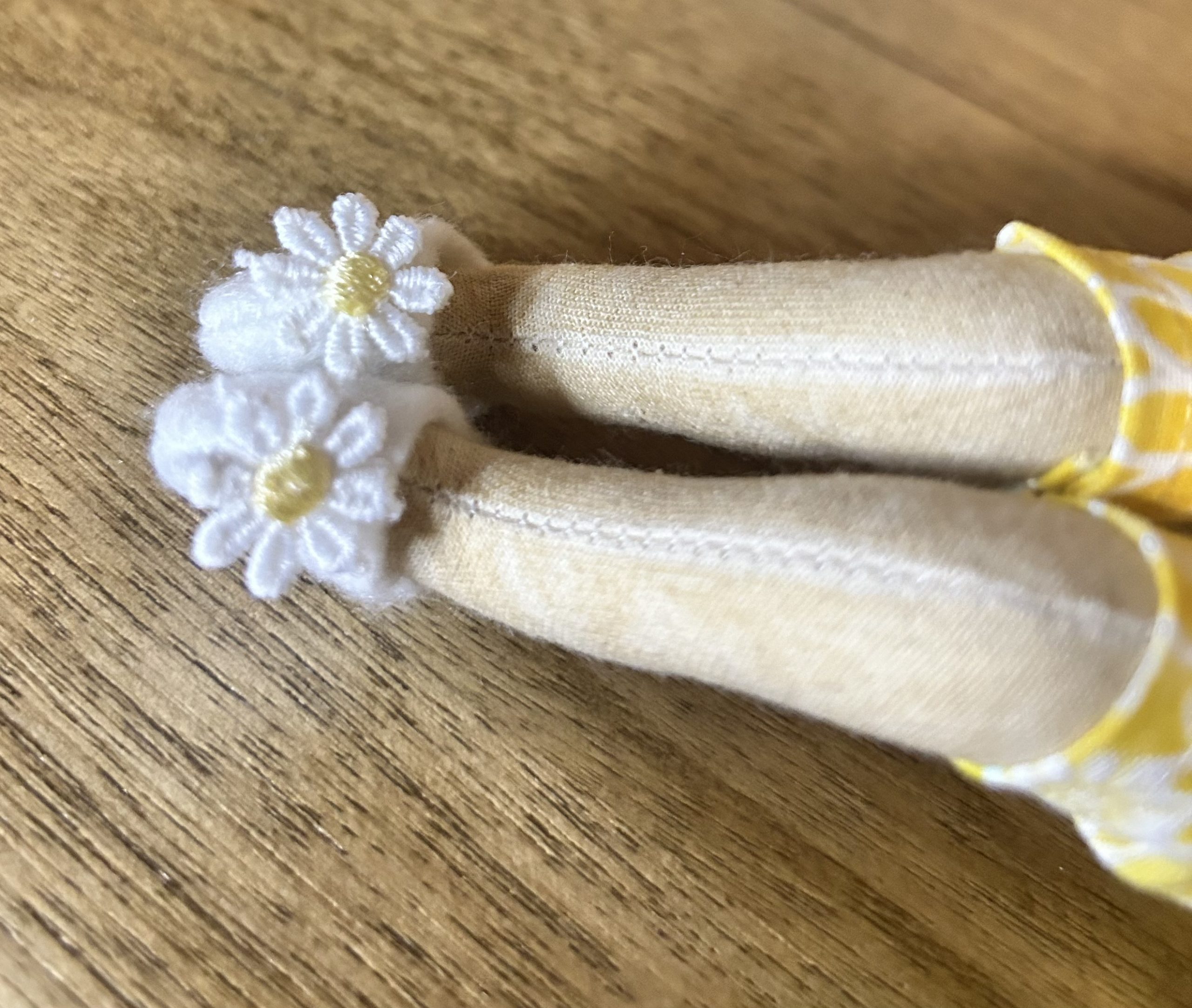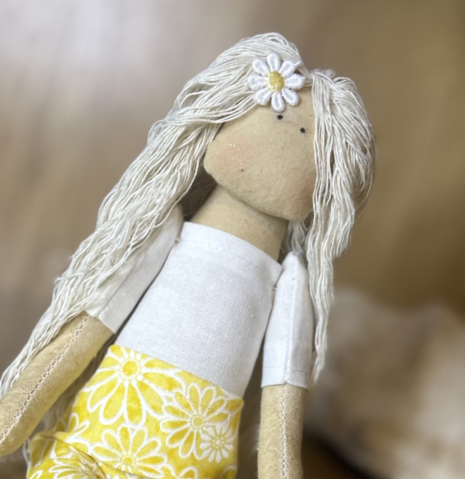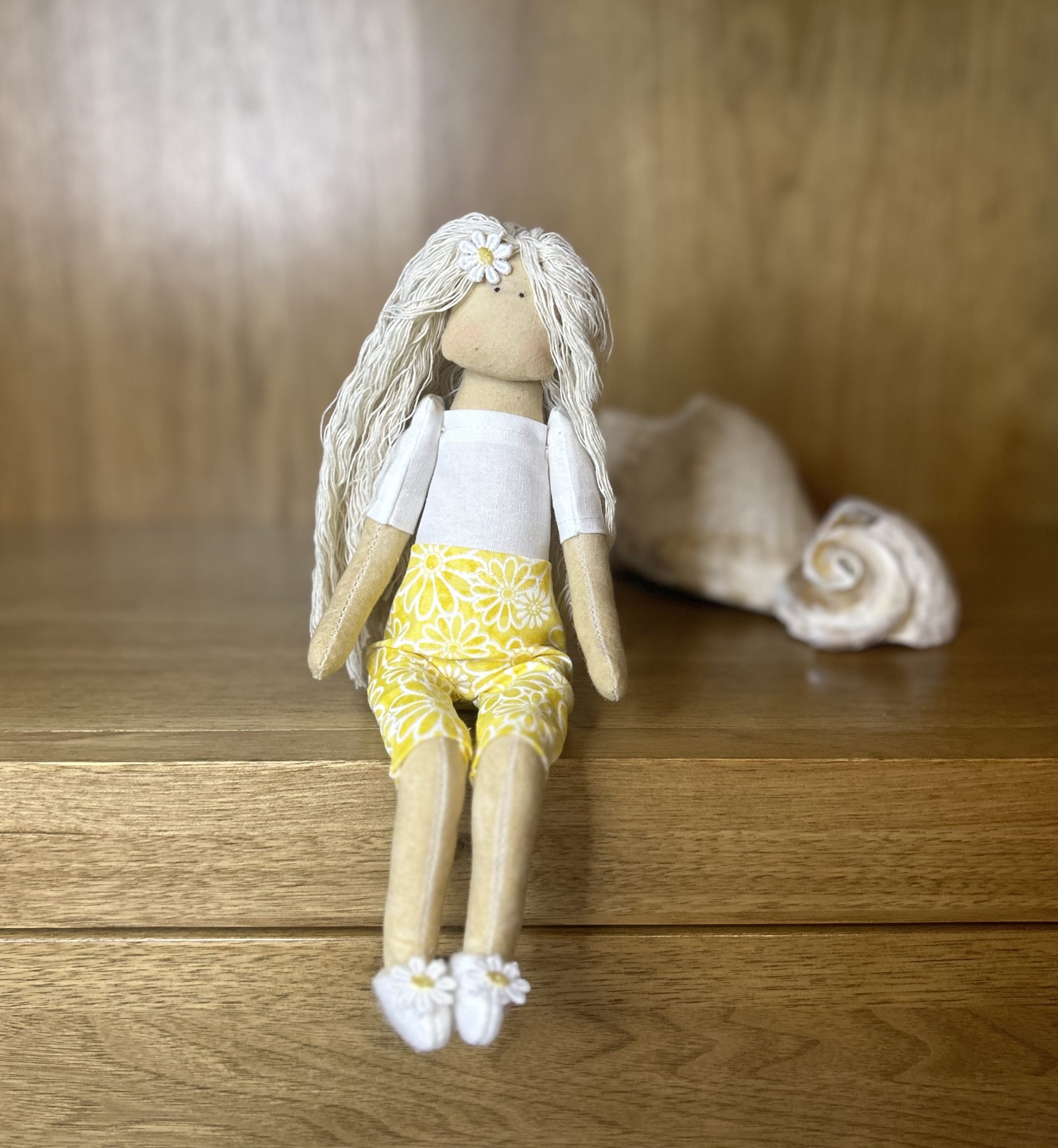 “Evie” is a beautiful handmade sitting fabric doll and is the perfect addition to any bedroom or nursery decor.