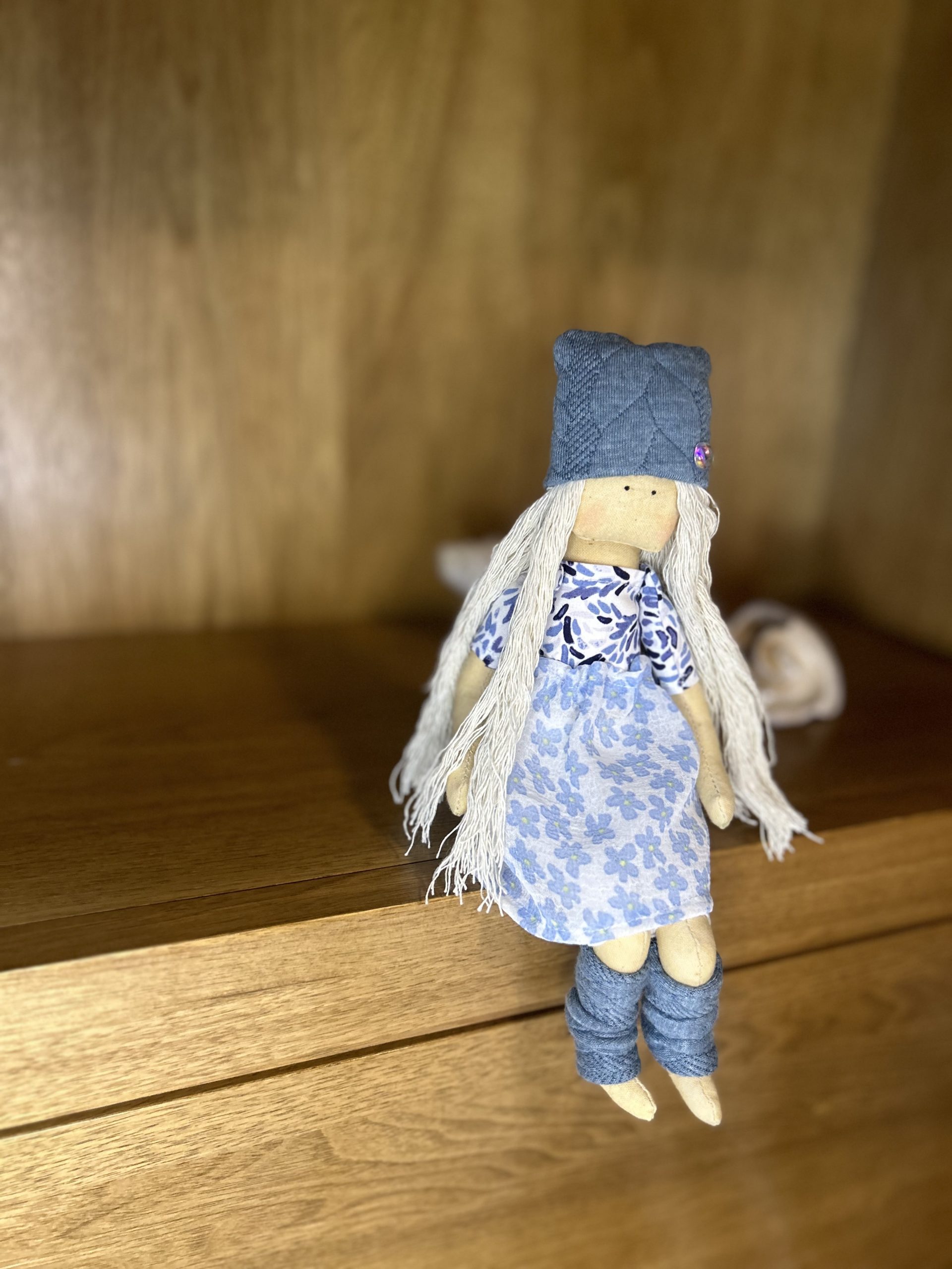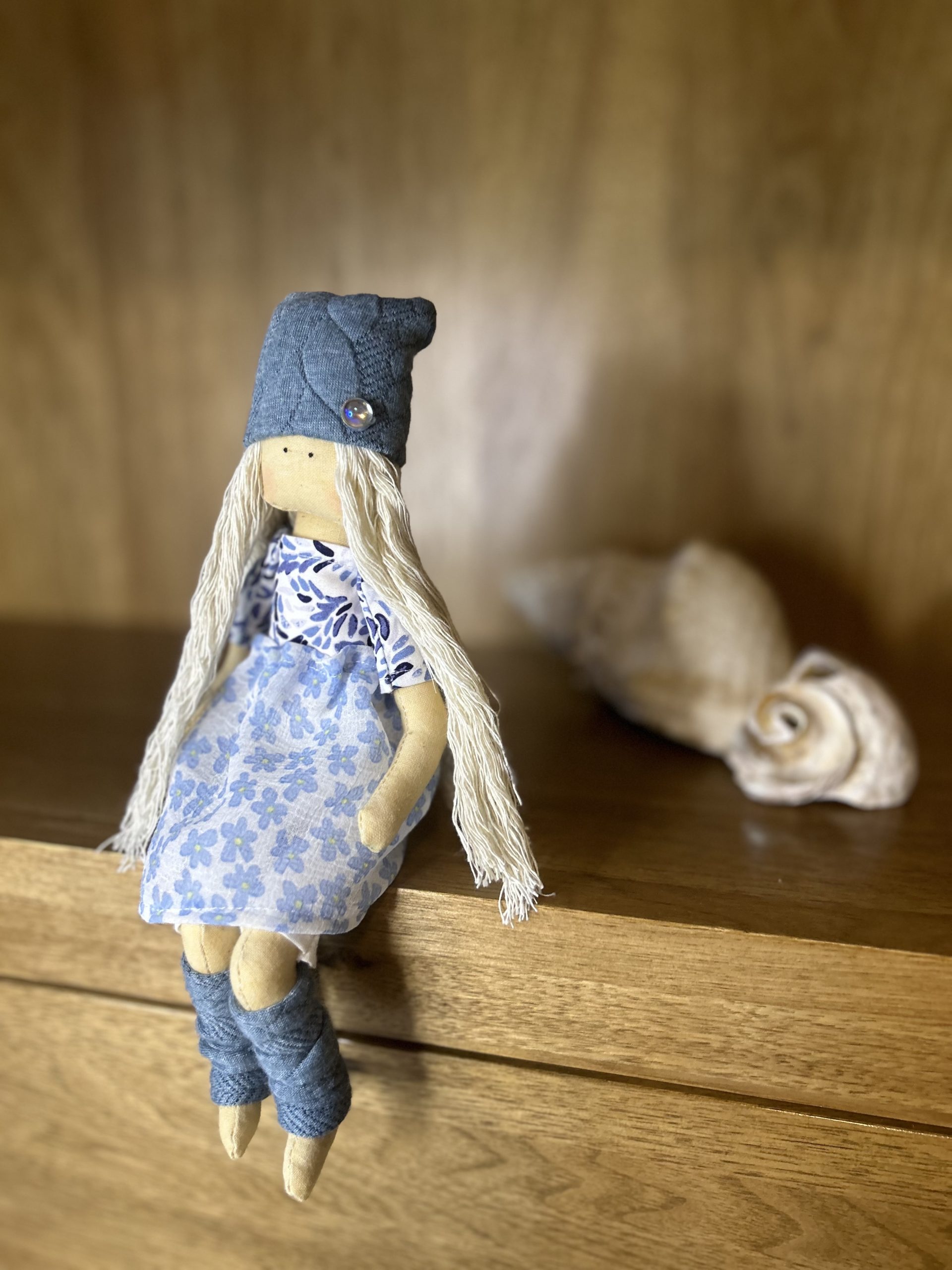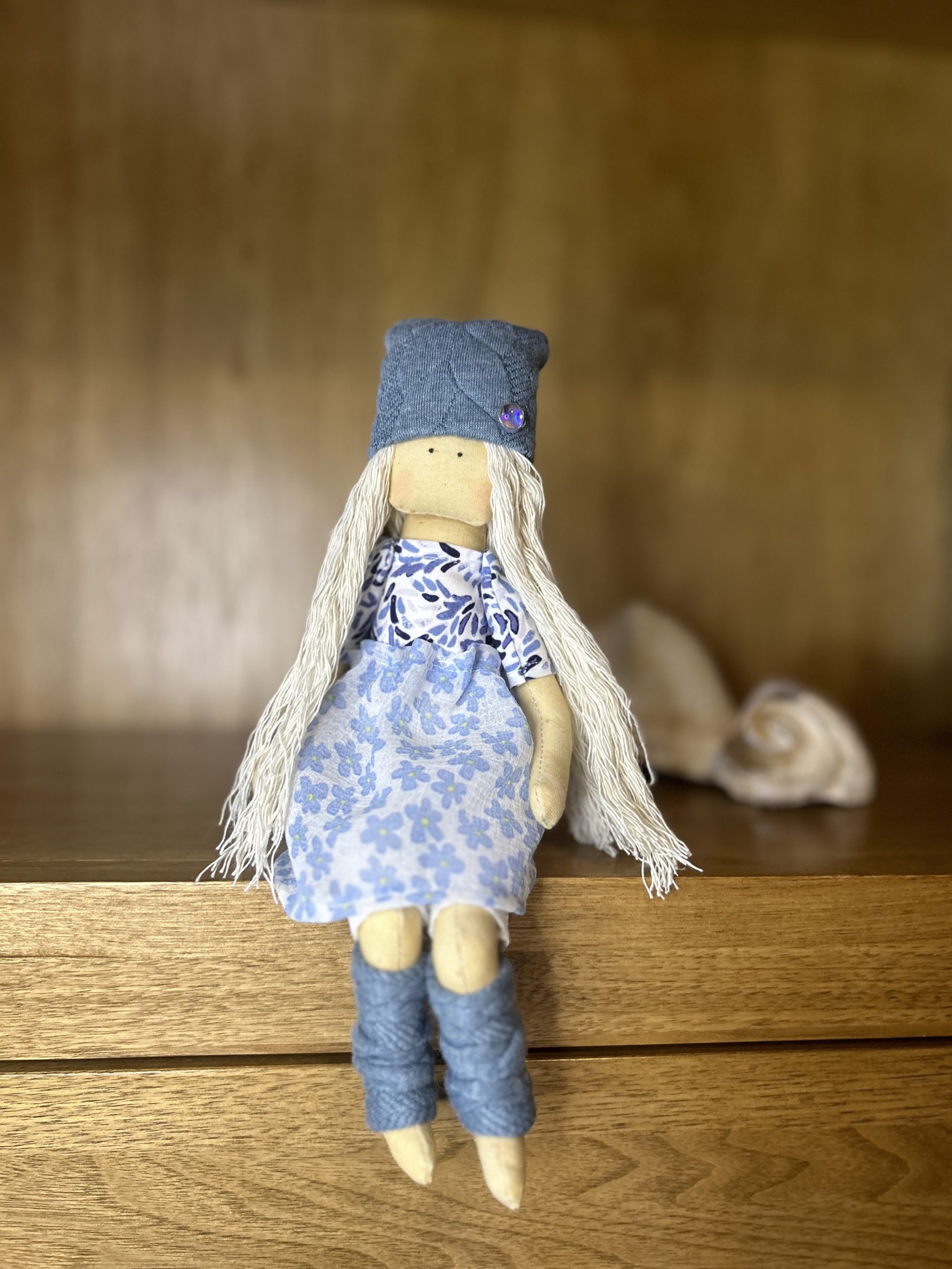She is handcrafted using a range of complimentary, quality fabrics, including 100% cotton and polyester. Her body is naturally dyed using tea to give her a warm glow, and her stylish hair is made using new high quality natural recycled macrame cord.