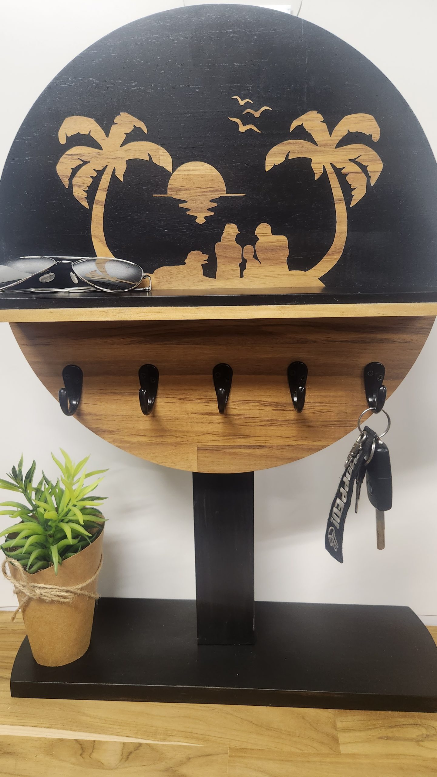 Beach Sunset Black & Timber Entry Keyholder with shelf. Original functional Art for your Home! Hang your bits and pieces and keep it neat and organised. Perfect as a gift, each one uniquely handmade. Simple and elegant with an acrylic painted silhouette of a family and their dog watching the sunset on the beach.