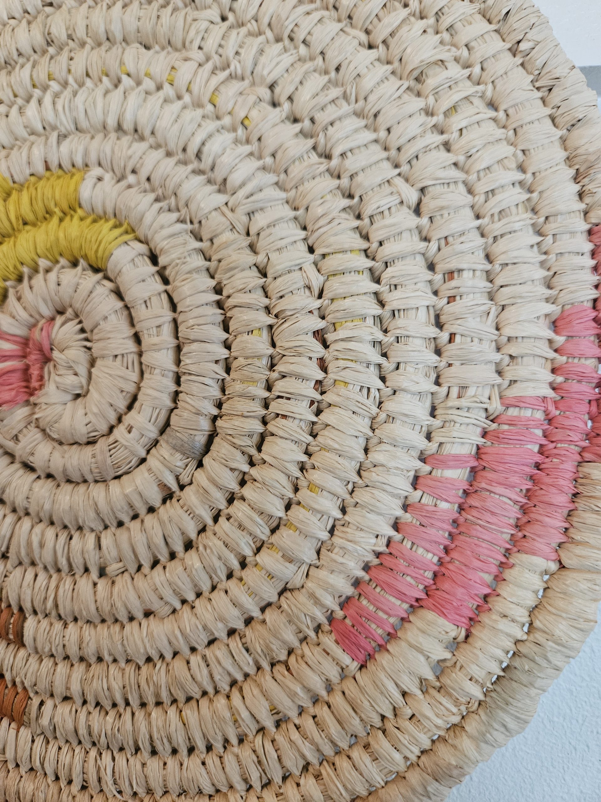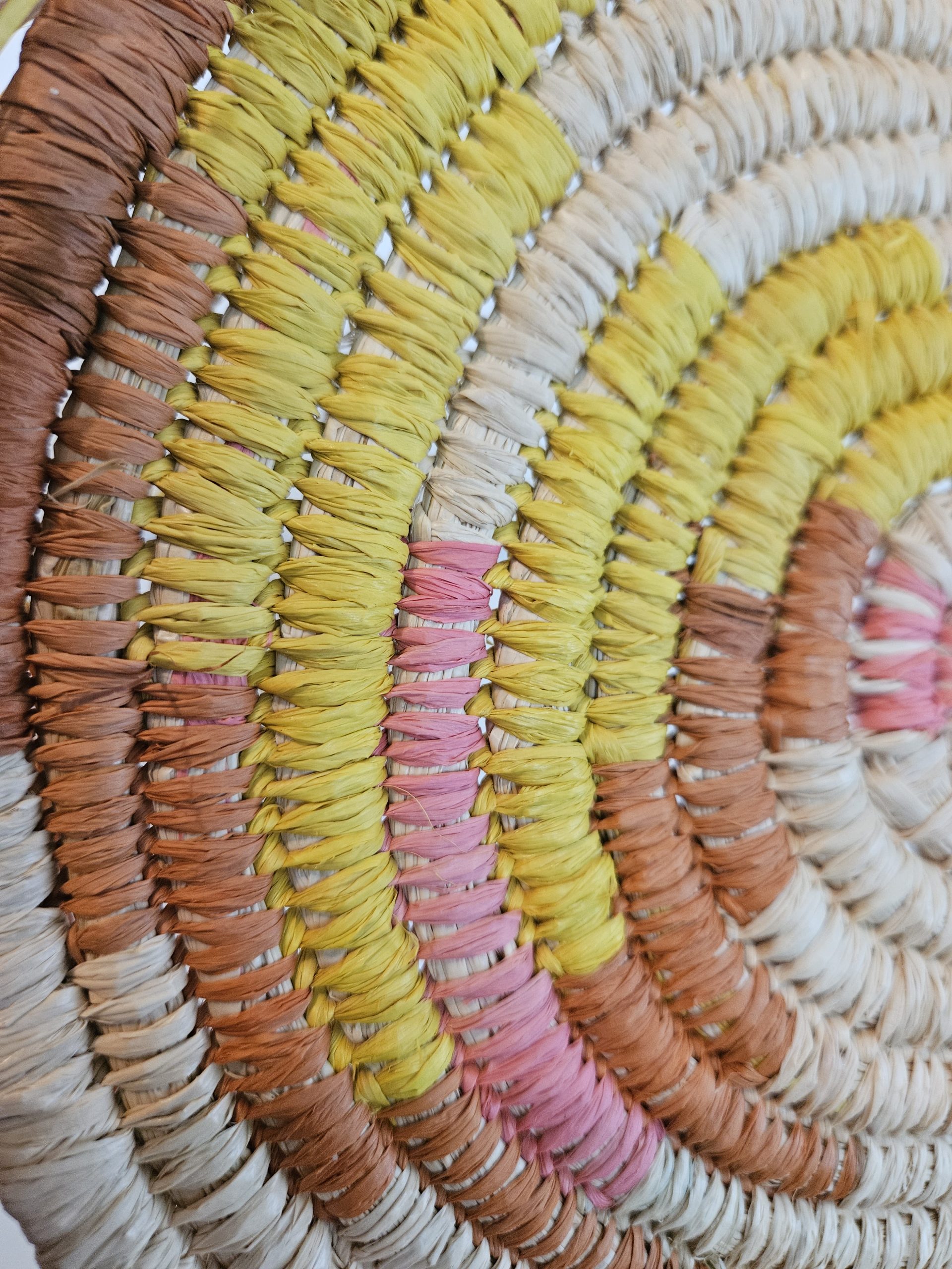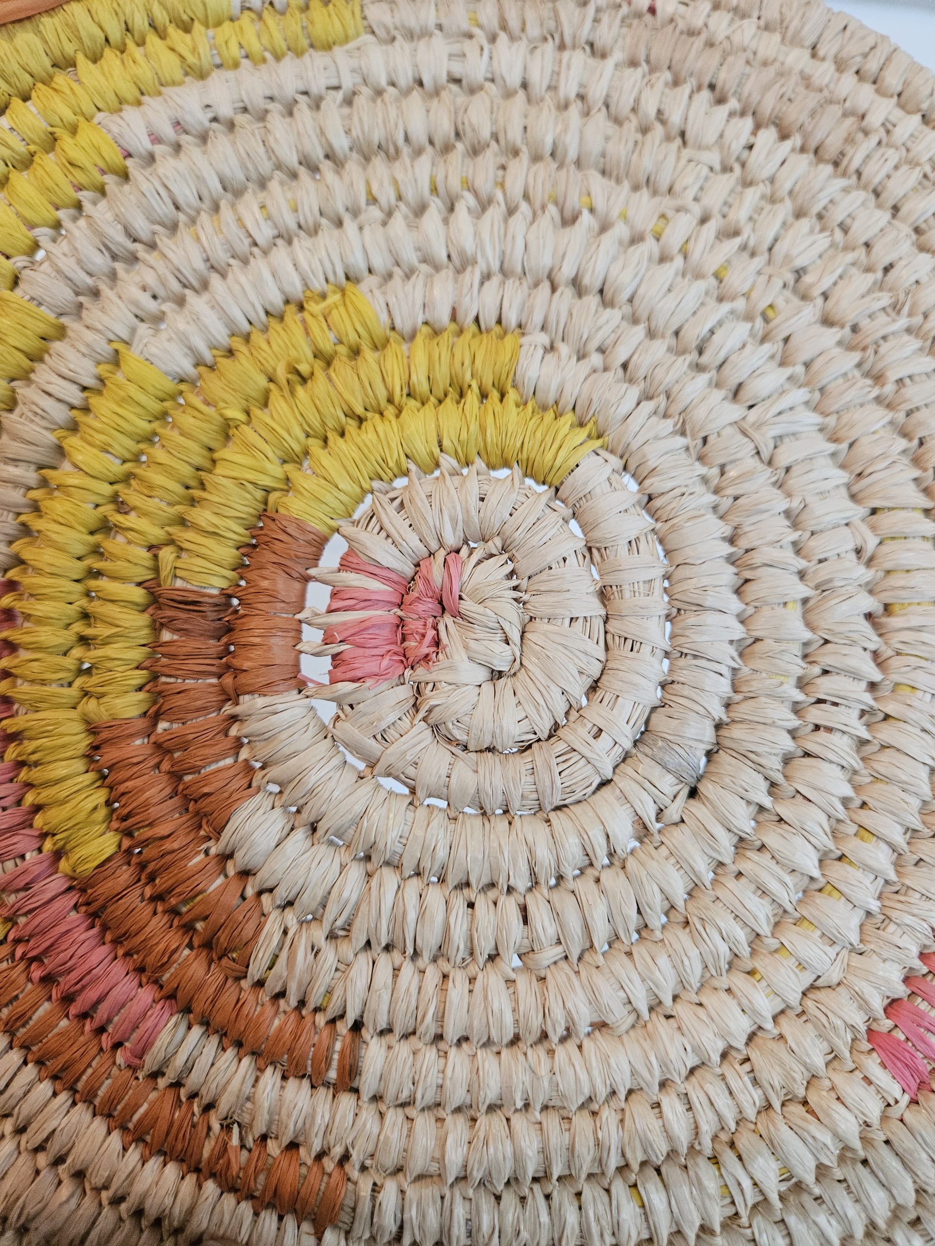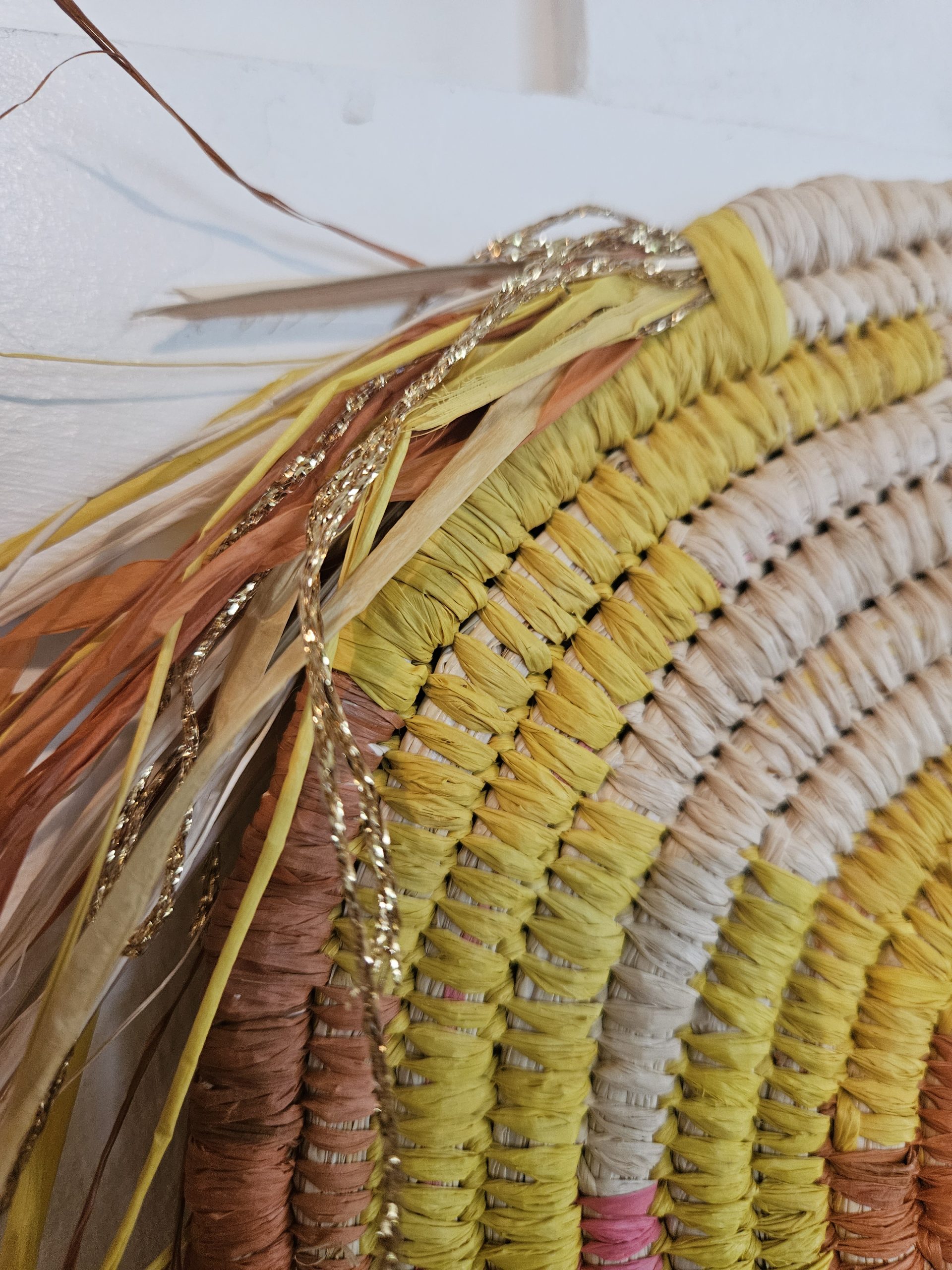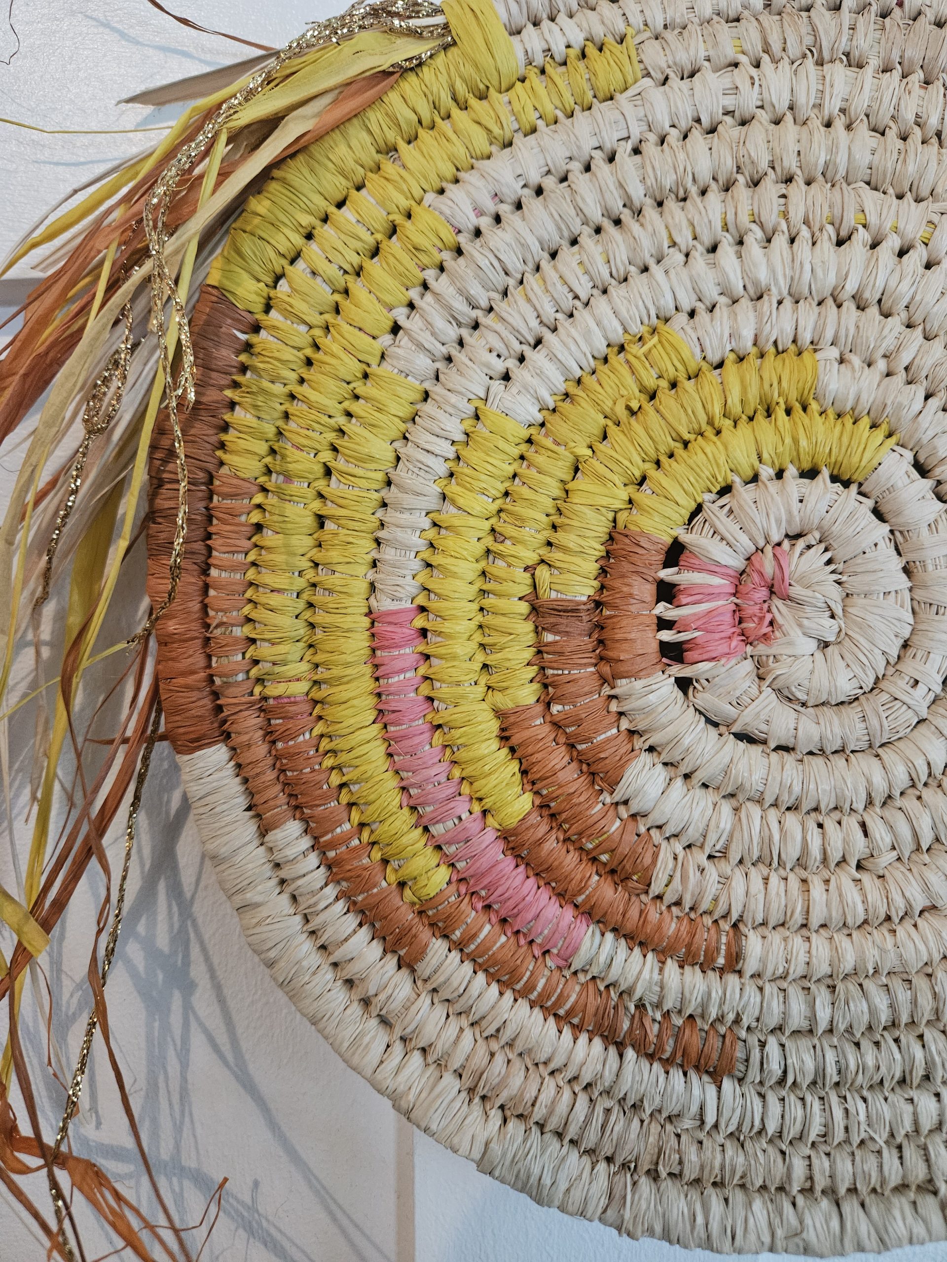 Jazz up your walls (or coffee table) with this handwoven coil wall hanging featuring premium raffia and gold thread.