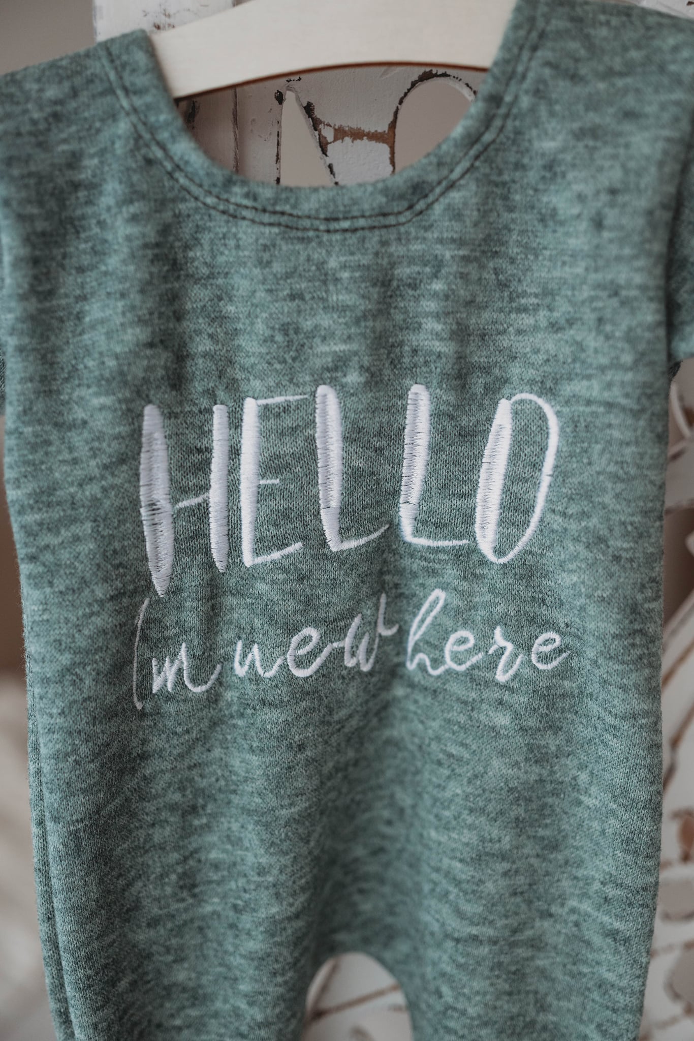 embroidery reads ‘Hello, Im new here’