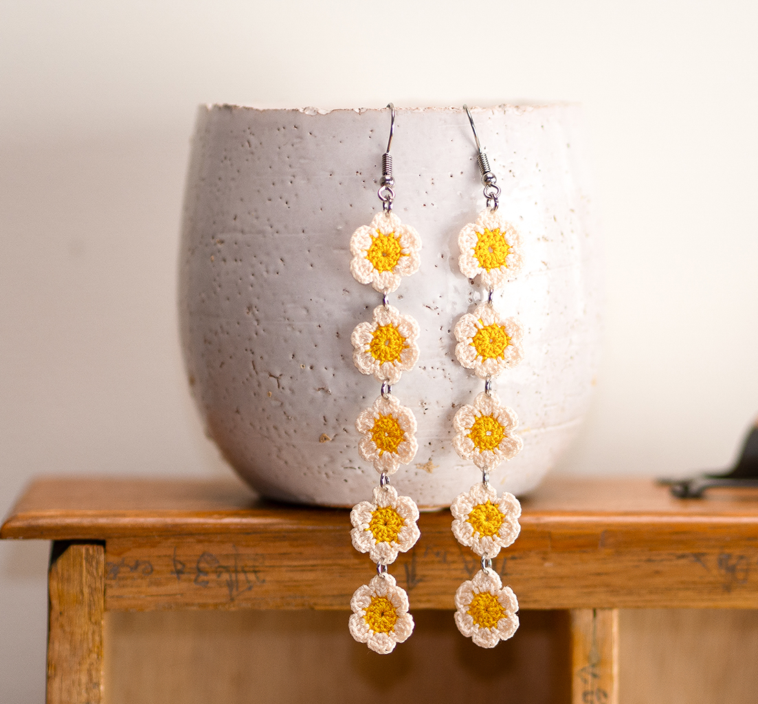 Chain of daisies micro-crochet earrings handmade with sewing thread and 0.6mm crochet hook.