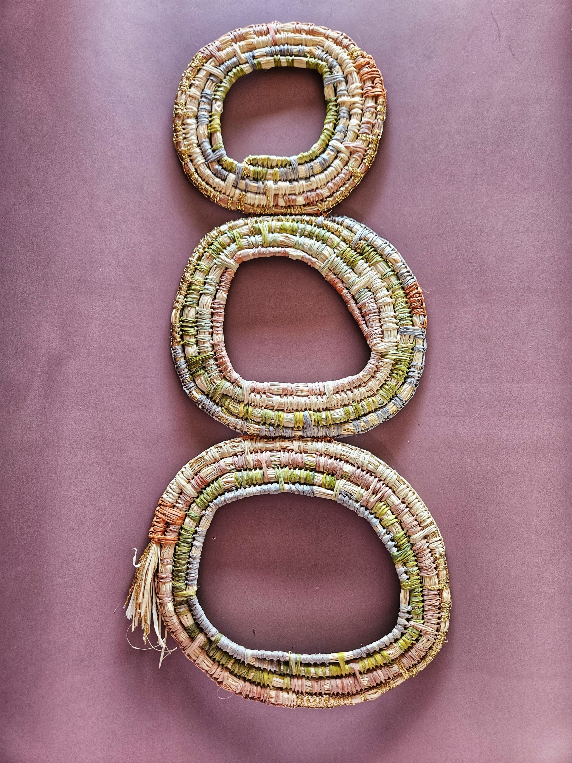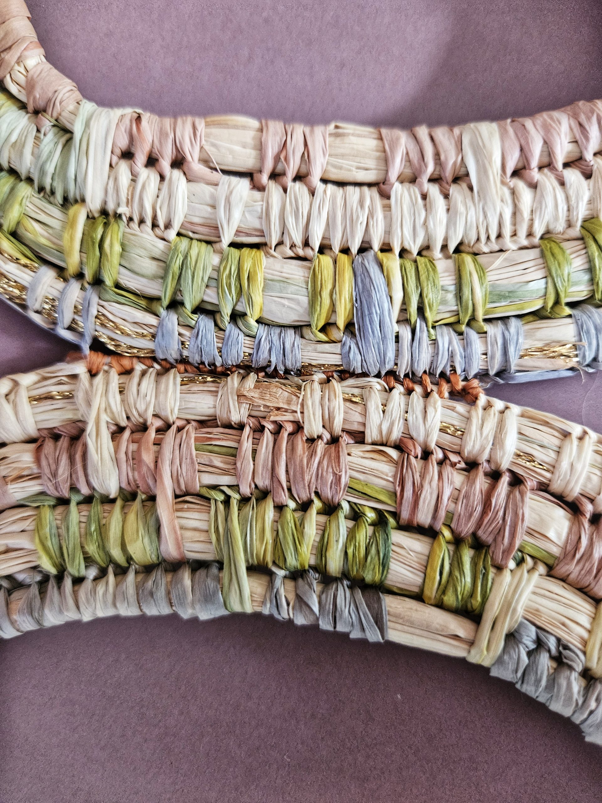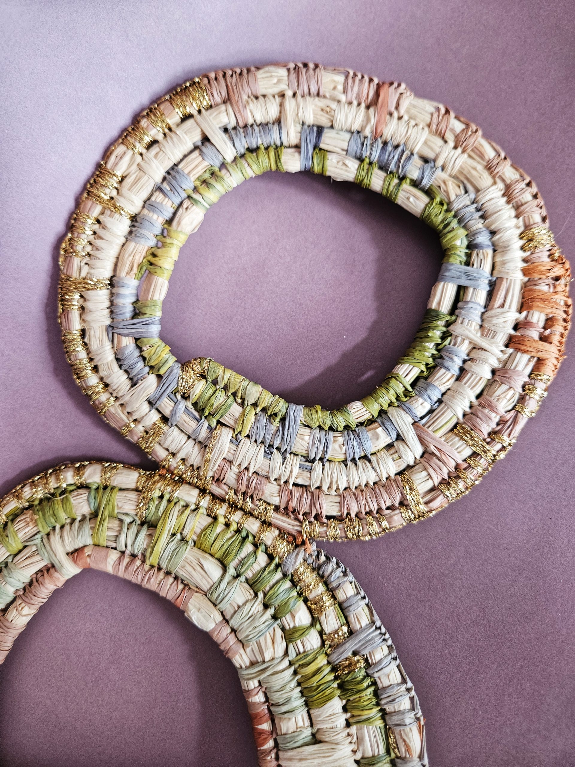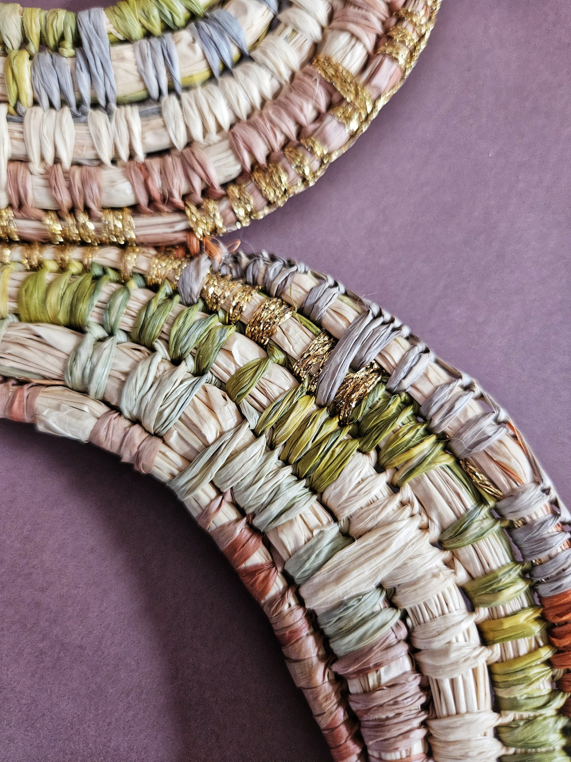 Handwoven wall art featuring premium hand-dyed Madagascan raffia and gold thread.