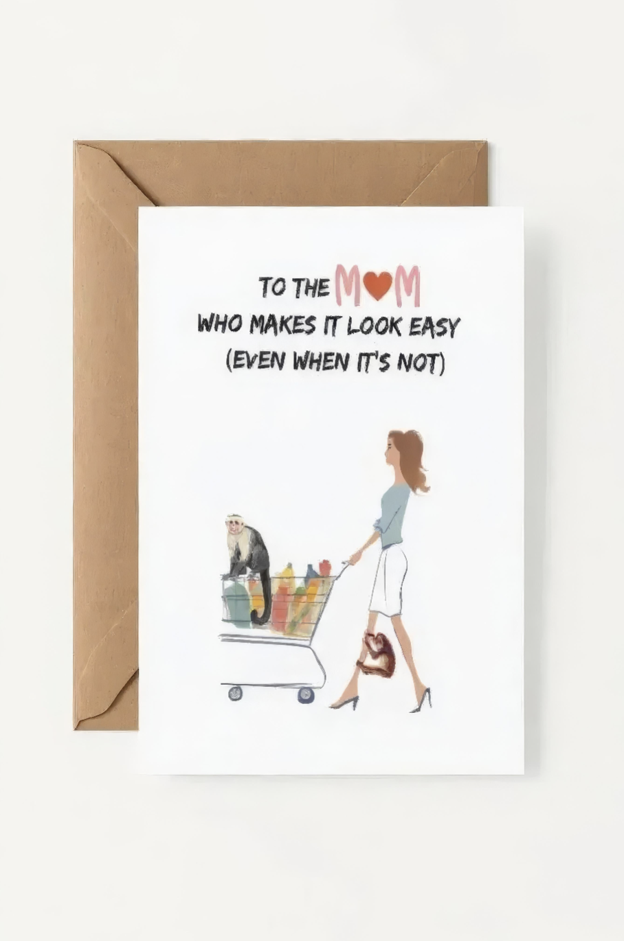 Motherhood isn’t always glamorous, but somehow, she pulls it off — groceries, kids, chaos and all. This card is a playful nod to the women who make the impossible look effortless (even when it’s anything but). Equal parts admiration and cheeky truth.