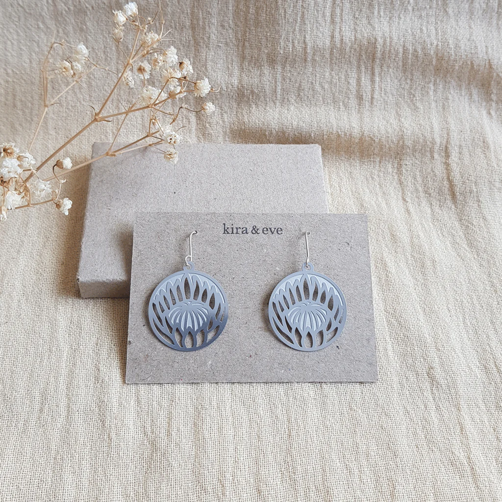 Made from premium quality stainless steel, our Protea Earrings feature both cut through and etched components within its design, bringing focus to the centre of the flower. These lovely lightweight earrings feature sterling silver earring hooks and findings.