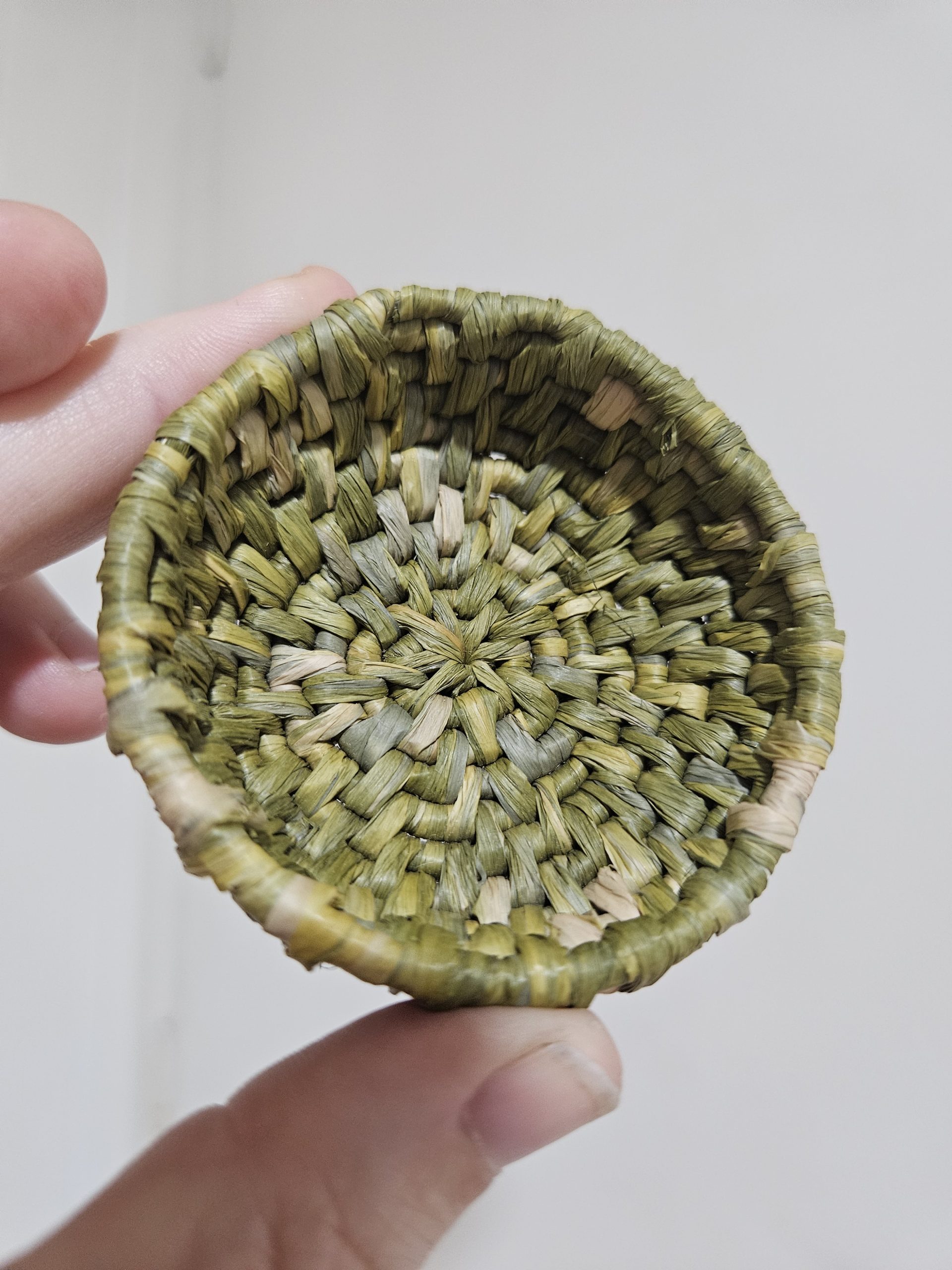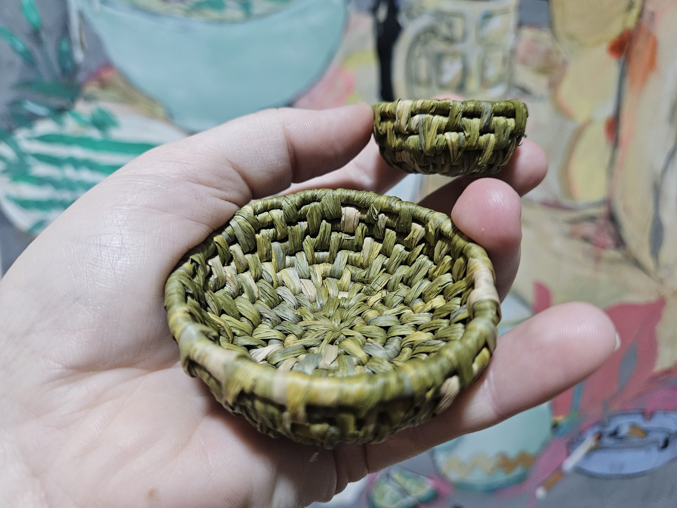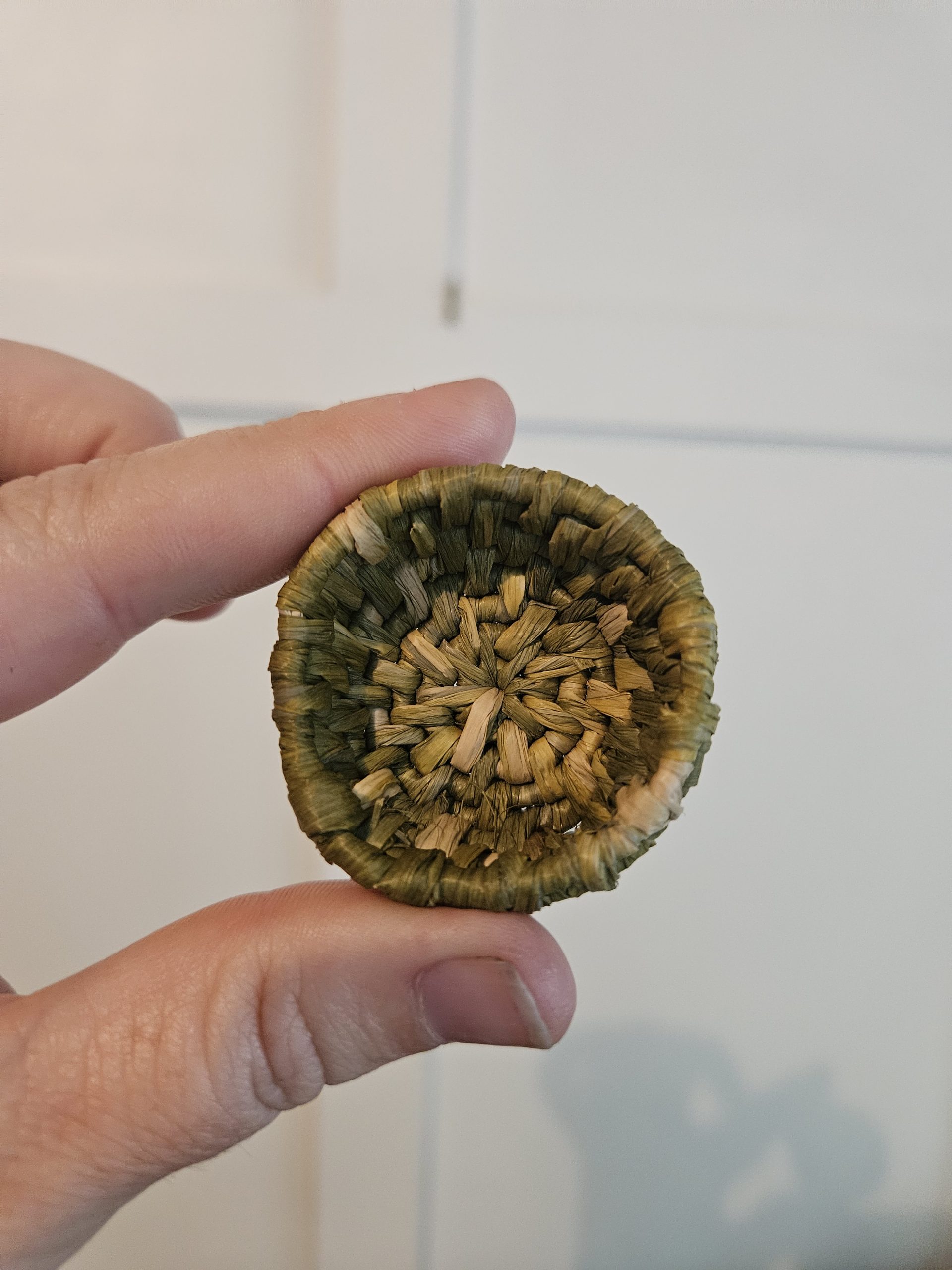 Maker’s note: I am not an Indigenous person and this is not a piece of Aboriginal art. I have deep respect for our First Nations people and their cultural traditions – always was, always will be. While examples of the coiled basketry technique can be found on nearly every continent, I do not wish for my work to in any way step on the toes of Indigenous creators. My work is inspired by my personal connection with Nature and my love of thrifting and upcycling. I am happy to connect you with Indigenous makers if you are pursuing Indigenous art.Â