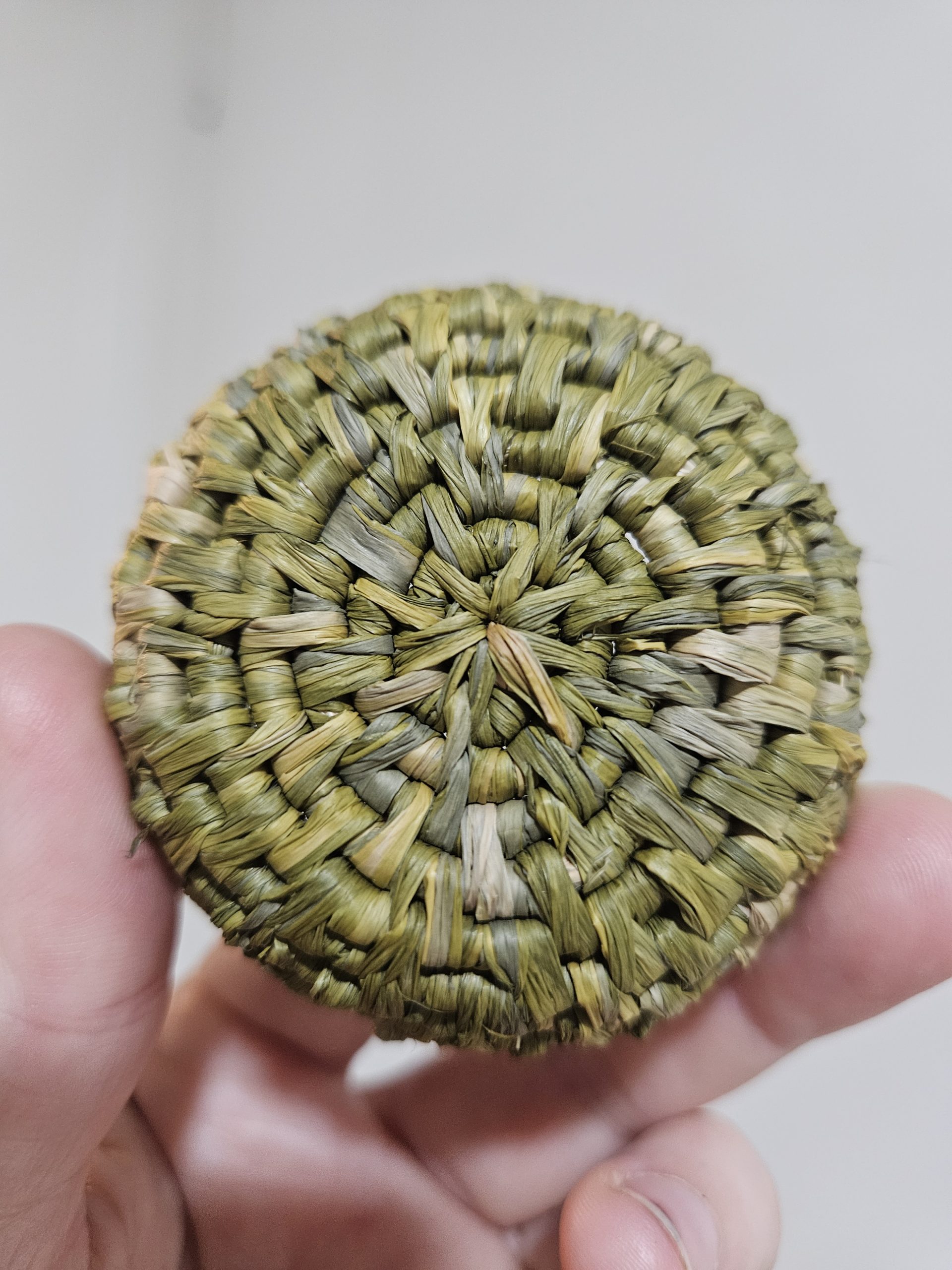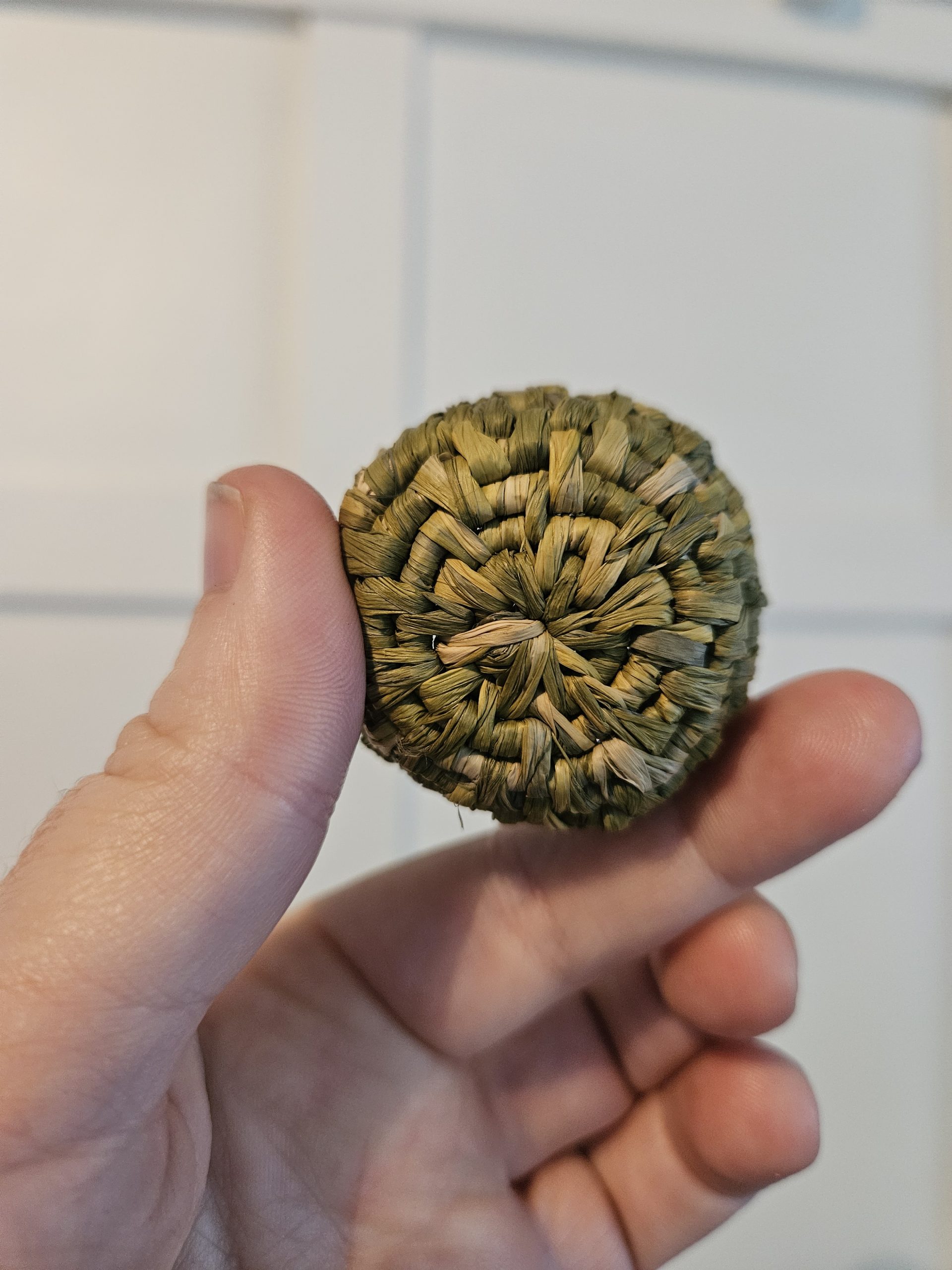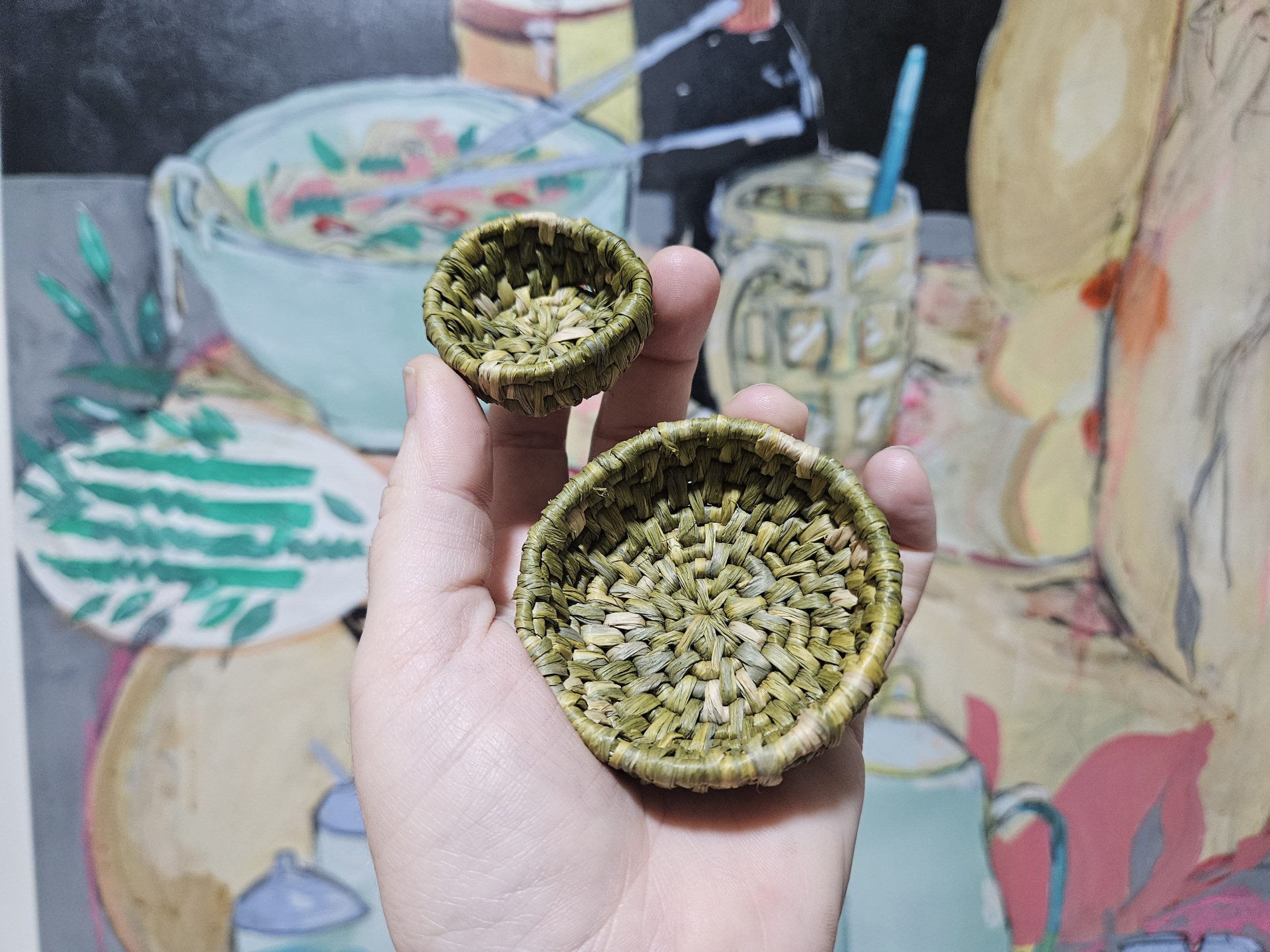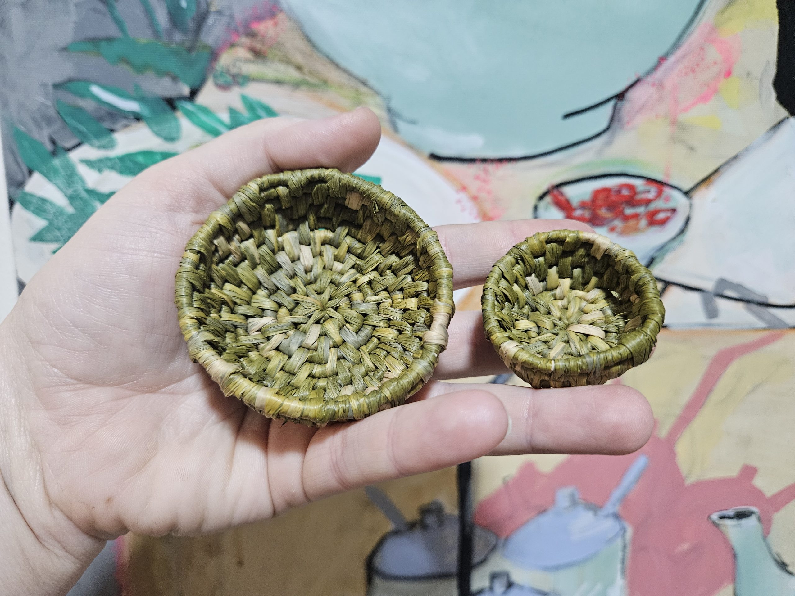 Maker’s note: I am not an Indigenous person and this is not a piece of Aboriginal art. I have deep respect for our First Nations people and their cultural traditions – always was, always will be. While examples of the coiled basketry technique can be found on nearly every continent, I do not wish for my work to in any way step on the toes of Indigenous creators. My work is inspired by my personal connection with Nature and my love of thrifting and upcycling. I am happy to connect you with Indigenous makers if you are pursuing Indigenous art.Â