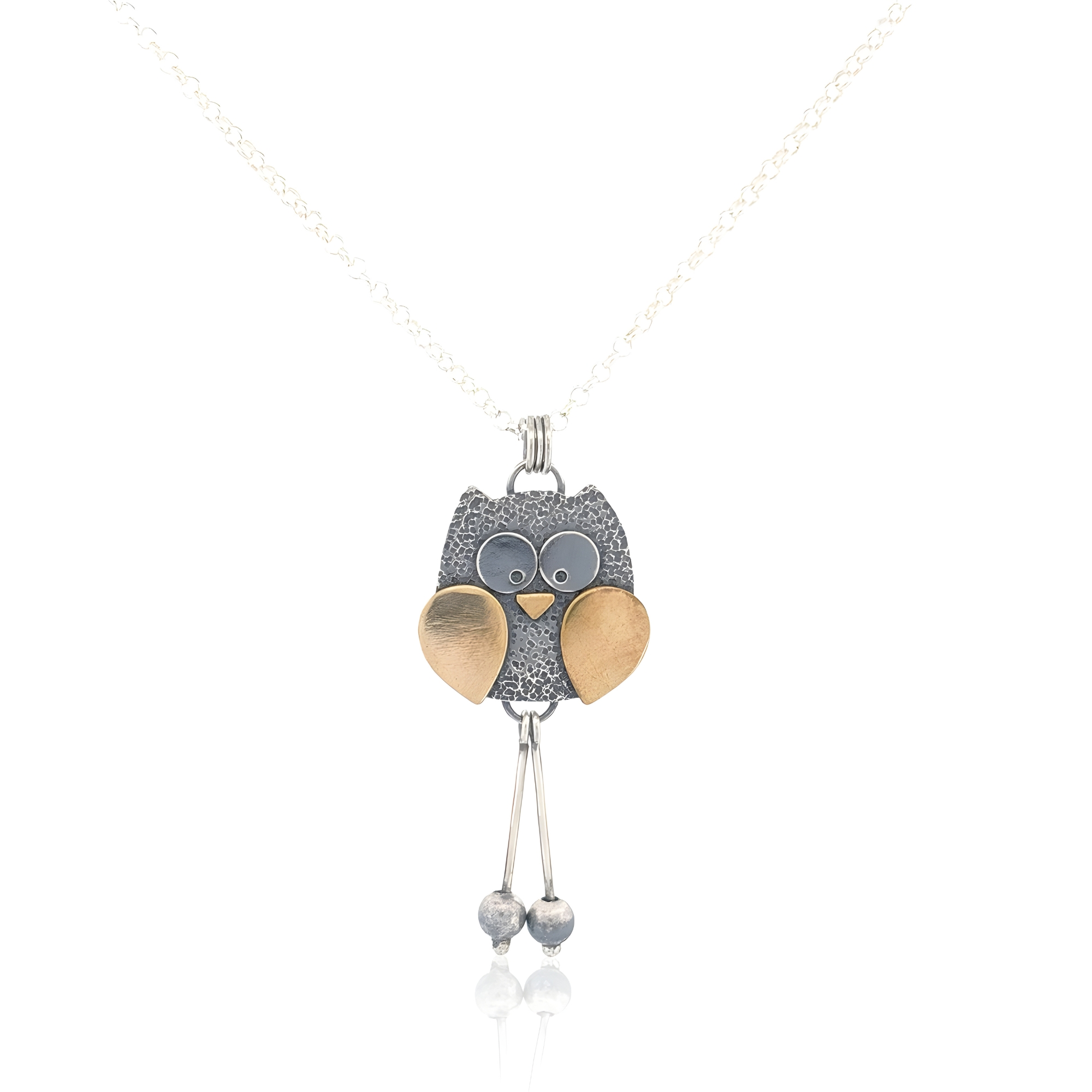 My enchanting Whimsical Owl Pendant is lovingly handmade to bring a little magic to your everyday. This delightful owl is full of charm and character. Its brass wings and beak add a warm, golden glow. With dangly little legs and movable silver ball feet, this owl has a playful spirit – it might even dance with you if you twirl just right. Every detail is carefully made with love and care, making each pendant one-of-a-kind, just like the soul that wears it. Whether it’s nestled close to your heart or gifted to someone special, this wise little companion is sure to spark joy and a sense of wonder. Perfect for dreamers, wanderers, and lovers of woodland whimsy.